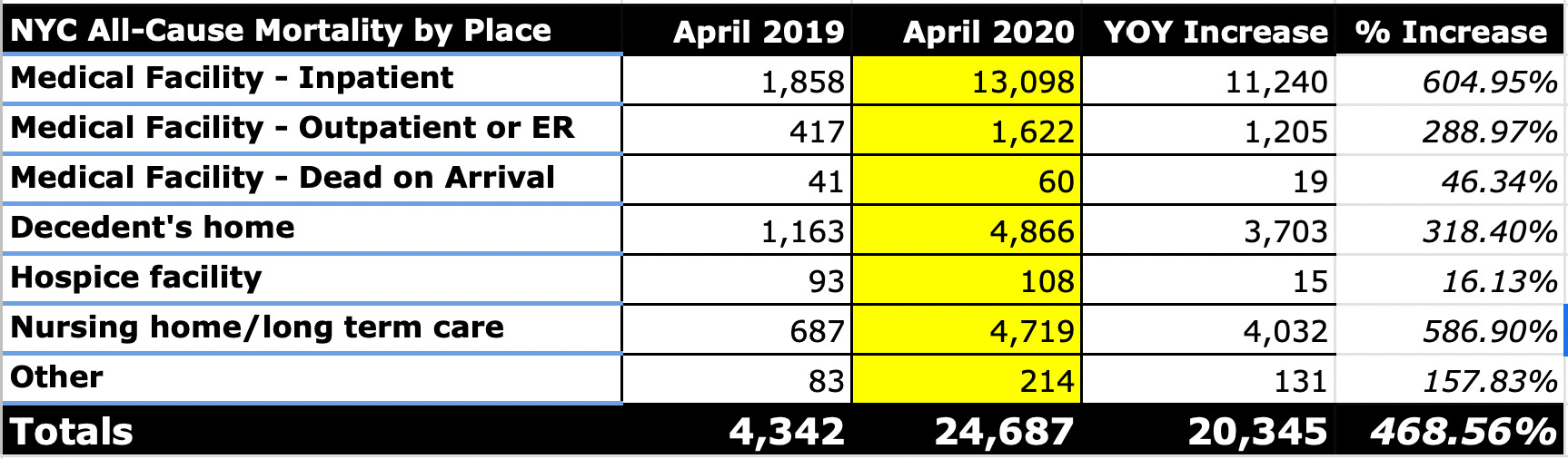 Here’s NYC all-cause mortality by place of death for February through May, 2020, followed by all-cause mortality comparison between April 2019 and 2020.3