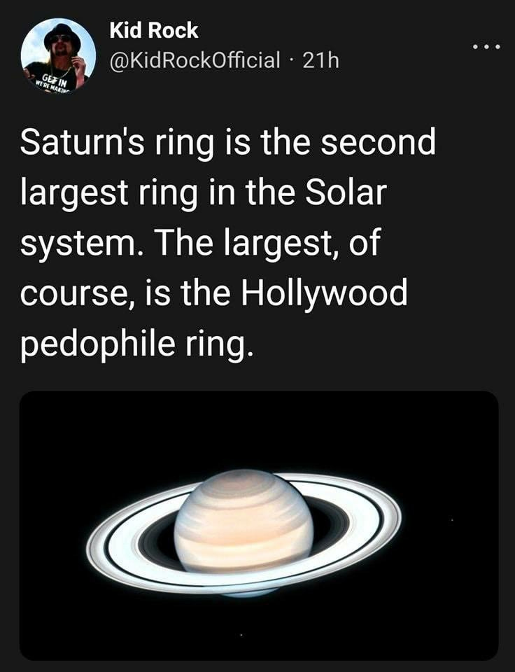 Kid Rock, can I get an amen for the brother? Speaking it like it is; he is incorrect somewhat, the pedophile ring in Washington DC where congress & senate sits is way larger, check it out!