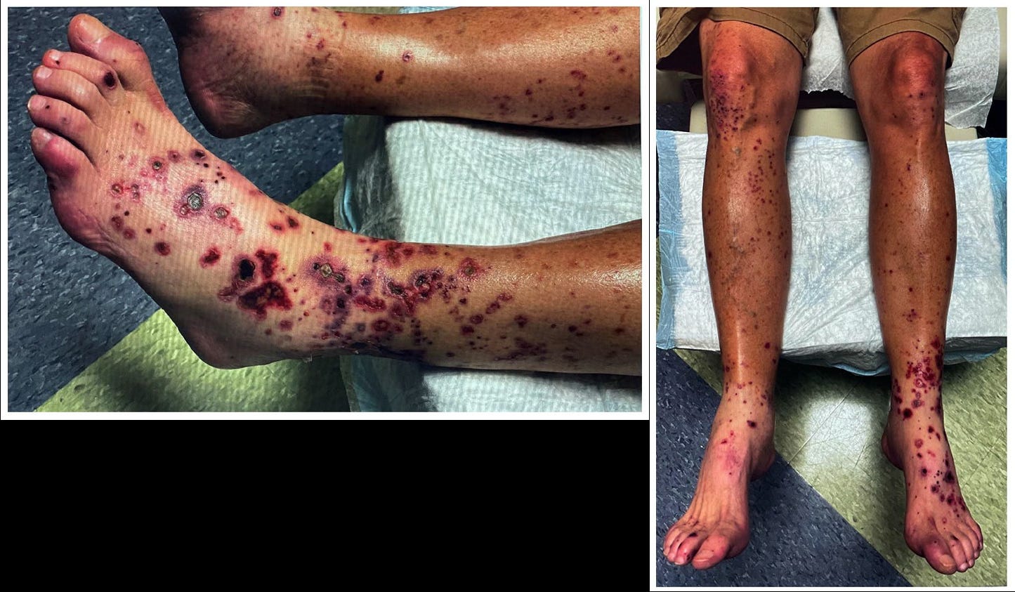Feb.2022, Greenville, SC - 65 year old man (above) developed lesions on his legs two days after receiving his 3rd Pfizer COVID-19 mRNA vaccine (booster). Biopsy of lesions showed a leukocytoclastic vasculitis and he was treated with steroids