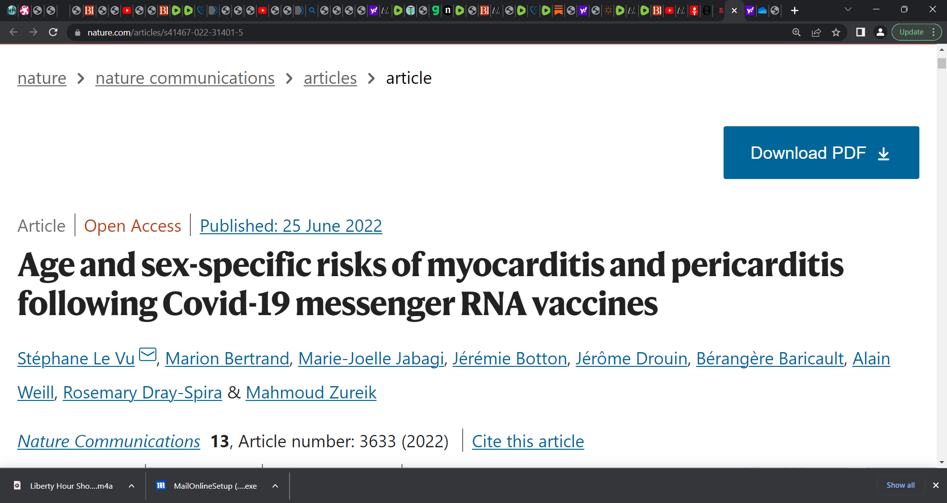 Stunningly elevated age and sex-specific risks of myocarditis and pericarditis following Covid-19 messenger RNA vaccines (Pfizer & Moderna); Le Vu et al.; elevated risks of myocarditis & pericarditis