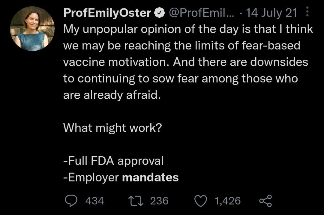 Emily Oster: "LET’S DECLARE A PANDEMIC AMNESTY We need to forgive one another for what we did and said when we were in the dark about COVID"; IMO, Emily is a bit deranged to think this; punishment!