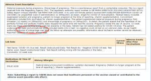 Unfortunately, VAERS does not indicate how far along these women were in their pregnancies when they were vaccinated for COVID-19. We can, however, get some information on the duration of a pregnancy from the descriptions entered into VAERS. For example, VAERS describes one mother’s miscarriage (VAERS patient 1185268) as follows: “3/15/2021—Went to my midwife for my first prenatal visit and that’s where I learned there was no heartbeat. 4 weeks along at the time of the vaccine and the heartbeat ended at 8 weeks along. This was my third pregnancy—and my first miscarriage. Estimated date of delivery was in October.”