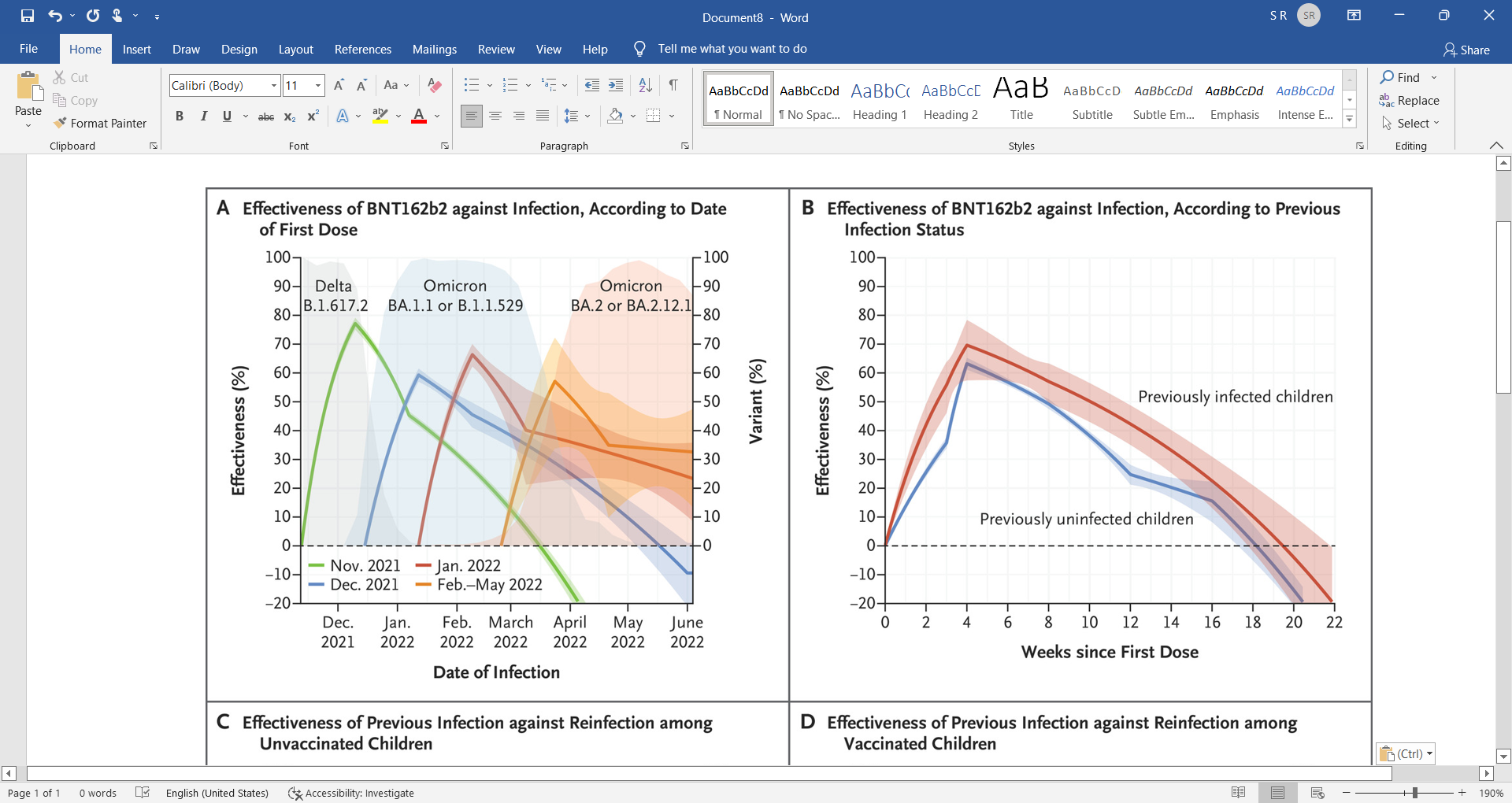 Look at graphs C and D, for it shows us that the the vaccinated children who had COVID infection prior (infection then shots), were at increased risk of re-infection than the children who were not vaccinated (yet had prior COVID infection). As such, it appears in this data that in children who were prior infected then got the vaccine, they were then re-infected.