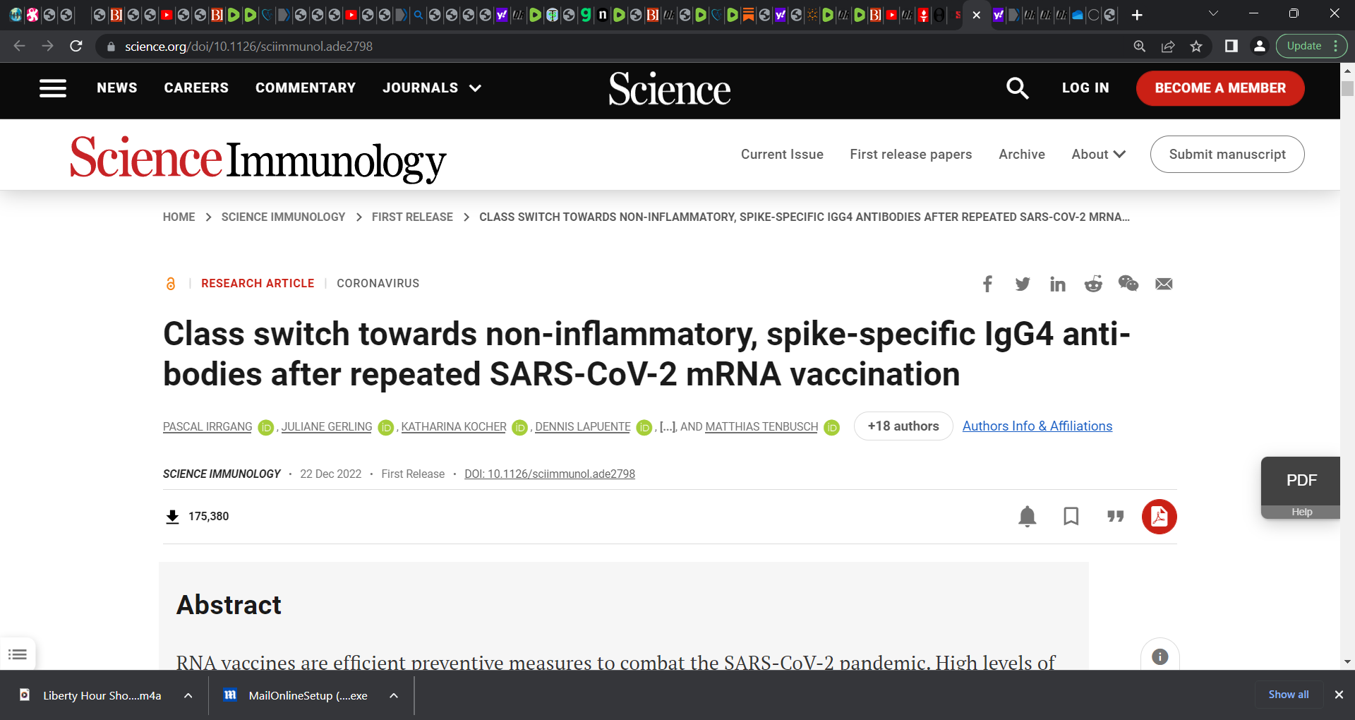 ‘Importantly, this class switch was associated with a reduced capacity of the spike-specific antibodies to mediate antibody-dependent cellular phagocytosis and complement deposition. Since Fc-mediated effector functions are critical for antiviral immunity, these findings may have consequences for the choice and timing of vaccination regimens using mRNA vaccines, including future booster immunizations against SARS-CoV-2.’