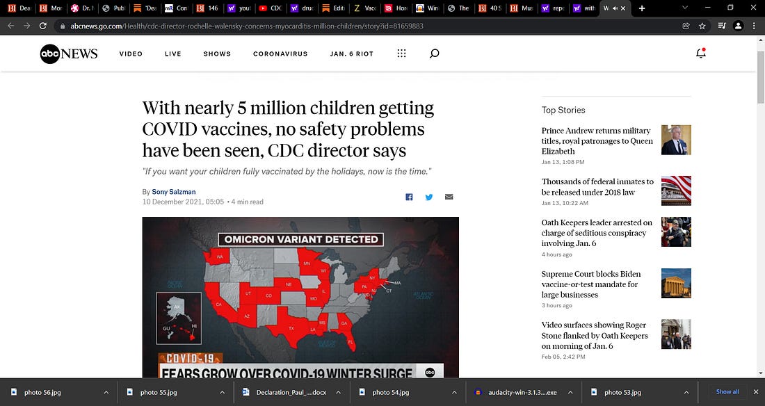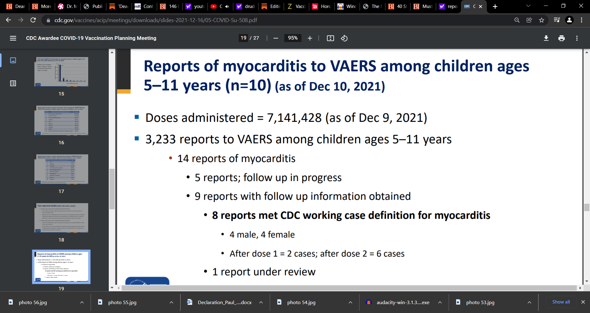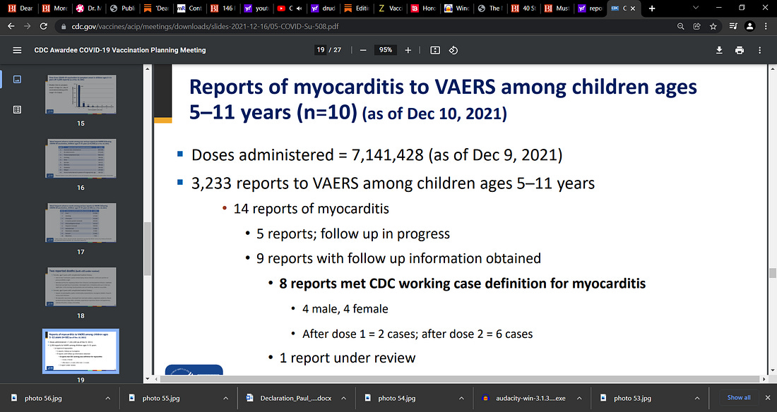 So the CDC director on December 10th says no safety signals found. She is saying no indication of myocarditis. She said so as above. In 5 million cases, not one instance of myocarditis.