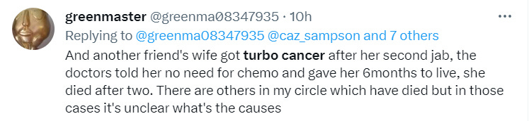 There are many anecdotal reports on twitter from people who describe “turbo cancers” suffered by their family members following COVID-19 vaccination. Most of these seem honest enough to take seriously, but it is clear that doctors are not taking these cases seriously enough.
