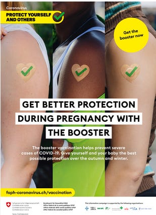 Despite these warning signs, the Swiss Office of Public Health still encourages women—in advertisements in French, German, and English—to get vaccinated. Across a photograph of three female arms with heart-shaped Band-Aids, the ads read: “GET BETTER PROTECTION IN PREGNANCY WITH THE BOOSTER.” Beck said the ads appear in railway stations and newspapers.”