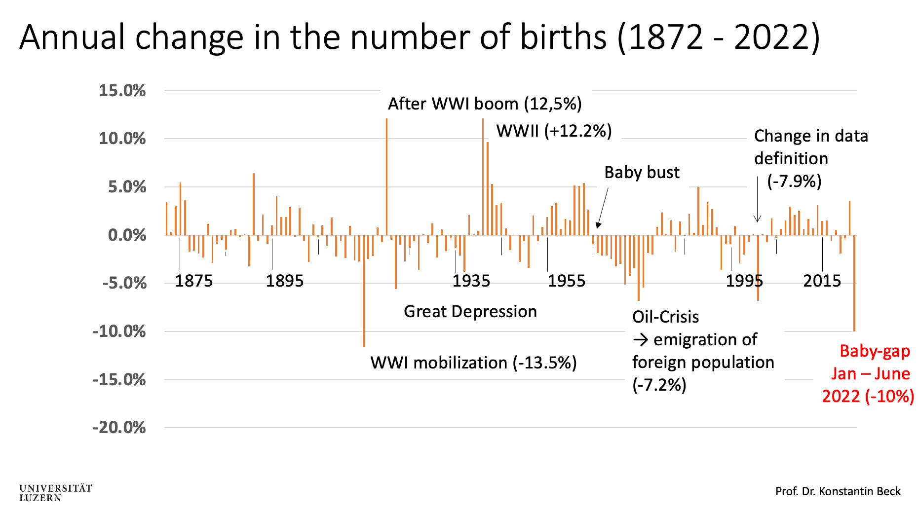 Dr. Konstantin Beck, a University of Luzern insurance economist and statistician, co-authored the leading Swiss report that found “historic” birth declines. The last comparable drop in births, 13 percent, he told me, was during the 1914 mobilization of the Swiss Army at the start of World War I.